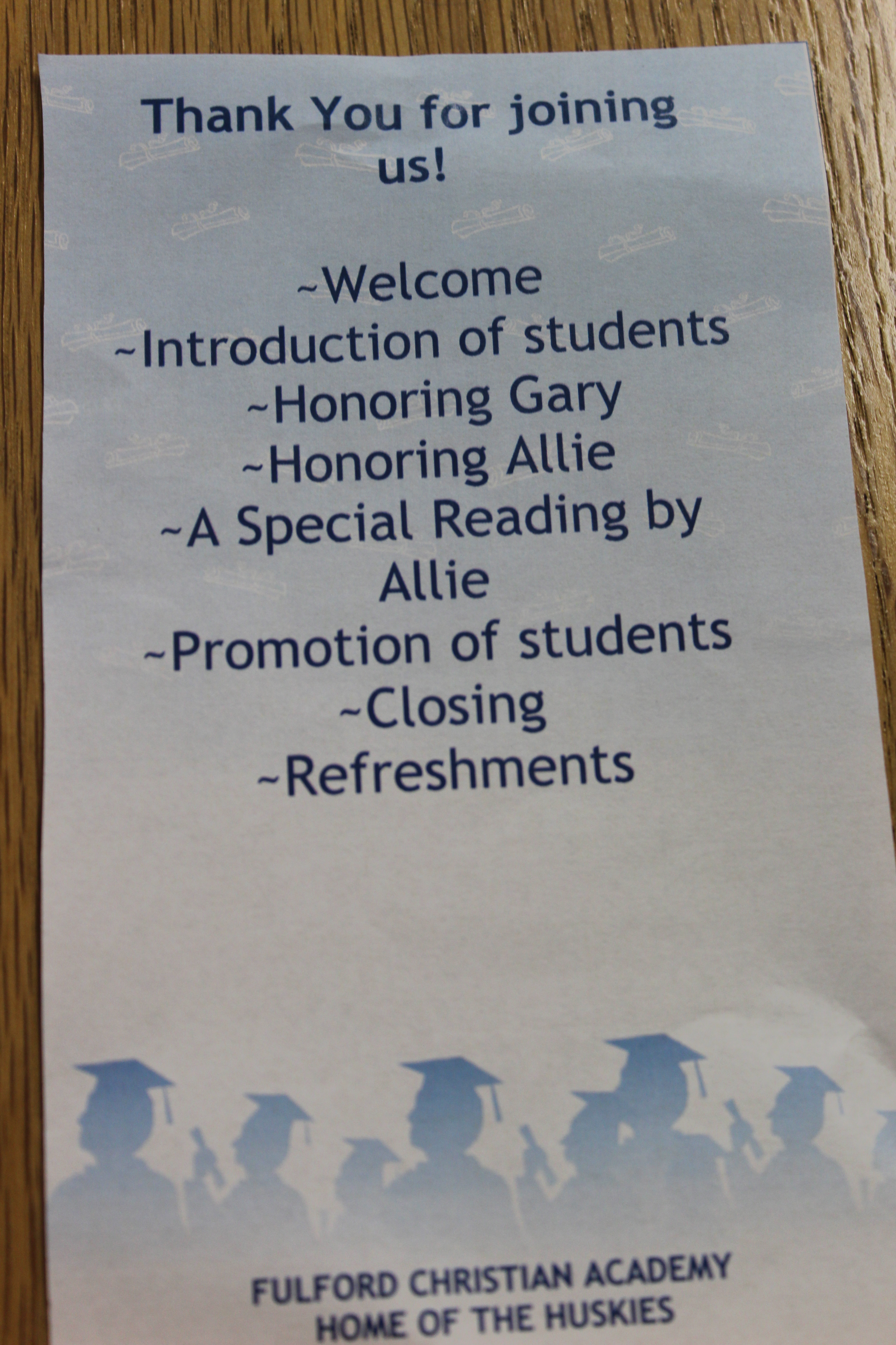 Allie had worked the last month or so on a book report that summarized the year. It also highlighted how she felt about home school and how much she enjoyed sleeping in and our occasional pajama days. She presented this report at our ceremony.