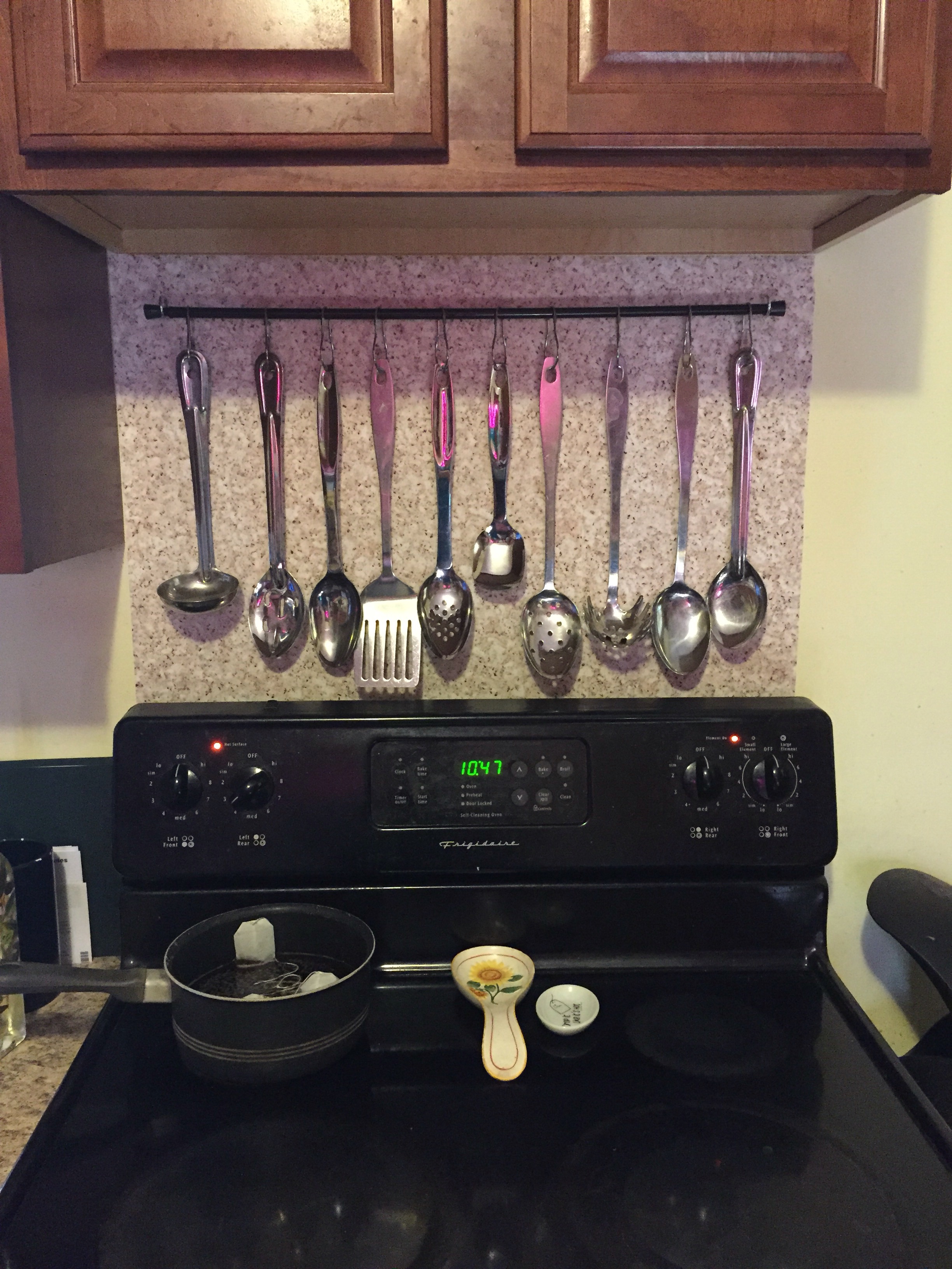 I went to Lowes and chose a roll of contact paper that would match my kitchen. Next, I kindly shoved those wires back in the hole and covered it with the contact paper. We put up a tension rod and some curtain hooks….and there ya go. I couldn’t be happier with the way it turned out.